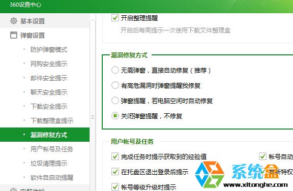 2、打开设置后,我们在左边的设置列表中找到“弹窗设置”,点击后会展开详细设置列表,我们选中“漏洞修复方式”;如下图: