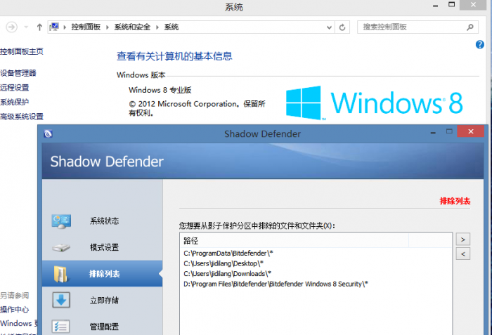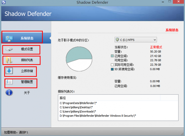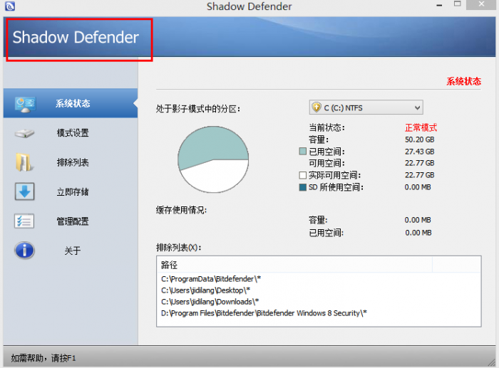 shadow defender中文版进入影子模式不需要重启计算机 ,而且还能保护多分区。你只要打开界面,选择你想要的分区,在前面打勾或者去掉勾,没sd的系统是一张白纸,sd就是在白纸上加一层透明的薄膜。你写的任何东西其实都只是在薄膜上,虽然看着像是写在白纸上了。重启系统就是换另一张薄膜。排除列表:就是预先在薄膜上开出一个个小洞,当然是用户开的。这样在有小洞的地方写东西就直接写在白纸上了。