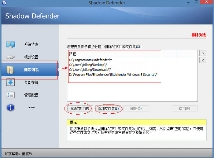 非常灵活的就是,Shadow Defender提供了文件和文件排除功能。你可以选择哪些目录不需要影子保护模式。