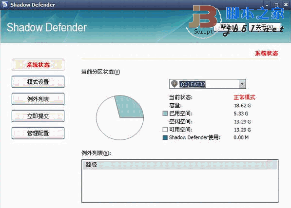 Shadow Defender这款影子系统界面简洁,操作容易,一般读者都能自如使用。安装完毕后,你会看到有几个项目出现在Shadow Defender的左侧,系统状态、模式设置、排除列表和立即储存。