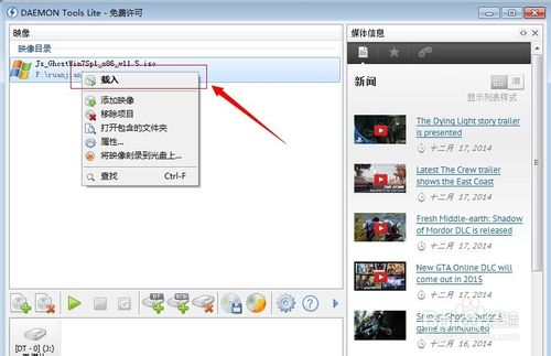5、然后在打开的光盘镜像文件上右击--载入命令。