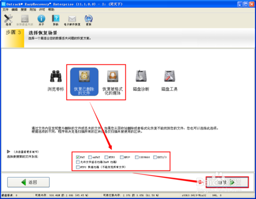 4、根据需要选择 恢复已删除的文件 或者 恢复被格式化的媒体 ,勾选下面的优盘格式,如果不能确认优盘格式,请勾选可能的所有格式,然后点击 继续 :