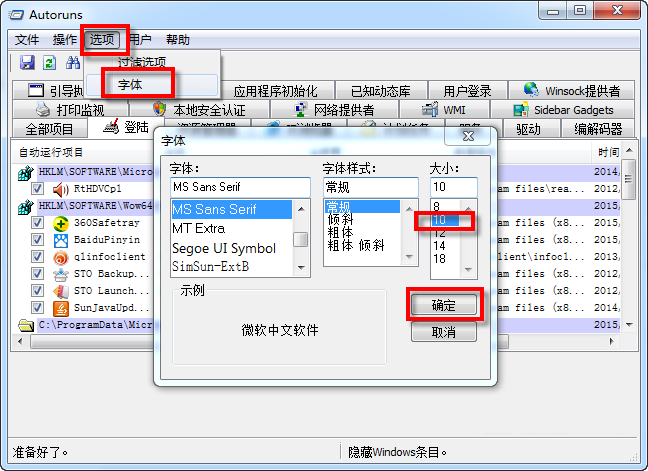 2、选项--勾选“隐藏微软项目”--按菜单栏下常用工具栏的“刷新”按钮,排除不必要的正常自启动项目;