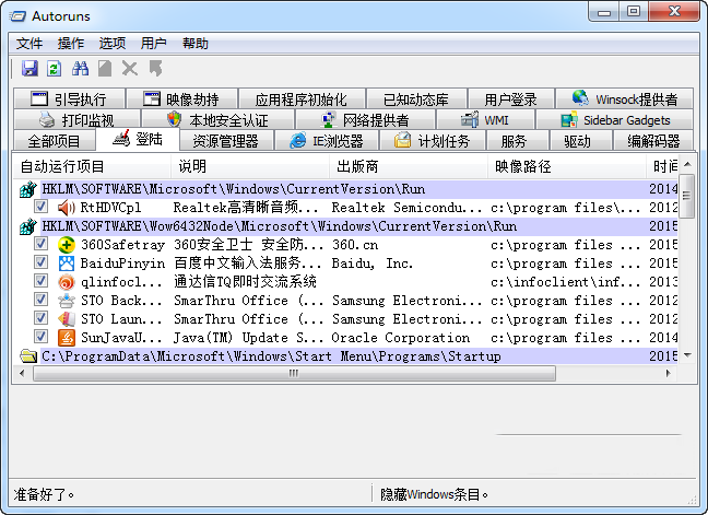 “全部”--顾名思义,全部的开机自启动项都在这个标签下啦。另外,它也是双击autoruns.exe弹出窗口缺省定位的标签,包括其他标签的所有内容。