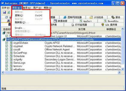 5、“搜索引擎”:有GOOGLE和MSN两个子菜单项,选择其中一个后,被选择的就被作为AUTORUNS的默认搜索引擎,并直接在“项目”下拉菜单或在自启动子项、自启动值项点右键弹出菜单的第五项反映出来。