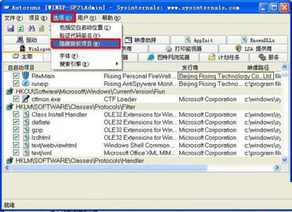 (三)“验证代码签名”、“隐藏微软项目”这两个功能,使得判断某个自启动子项和自启动值项是否是恶意软件更加简单,否则项目太多(一般有200多个),会看着发晕的。