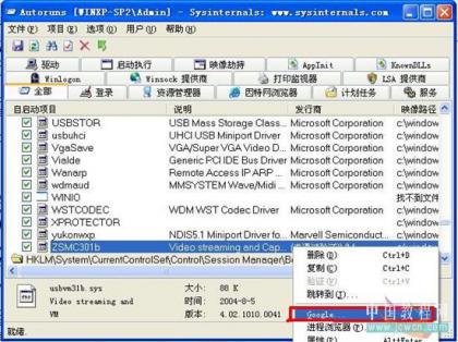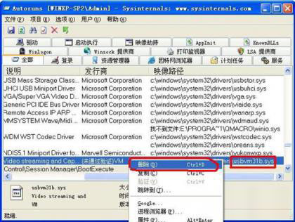 7、经过在网络上查找资料确认,认定该文件为病毒文件(为说明问题才这样说的,别当真!),这就证明ZSMC301B这个自启动项目就是病毒的驱动保护。在该项目条上右键,选择“删除”,删除了该自启动项之后, USBVM31B.SYS这个病毒文件失去了驱动保护,也就无用武之地了,而且可以直接用“SHIFT”+“DEL”删除(如果不删除此驱动保护,你会发现在删除“USBVM31B.SYS”这个映像文件时,会出现“该文件正在运行,请关闭相关的程序后再删除”之类的提示,或者即便能删除也会很快复活。这就是病毒或流氓软件热衷于此的根本原因)。
