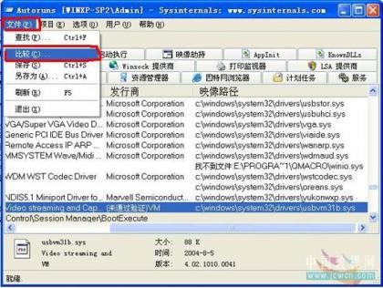 (二)利用“文件”--“比较”功能,可轻易找出当前系统自启动项比以前保存日志时系统增加的自启动子项和自启动值项,使检验添加自启动项的正常与否变得更加方便。