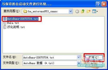 2、 “比较”:用于比较当前状态和以前保存过的日志的差异并设置标记。如果选择这个菜单项目,则弹出一个对话框要求你选择一个你保存过的以前的日志,选定所需要的日志后,点“打开”,如果选定的日志的自启动子项、自启动值项与当前的状态有差异,AUTORUNS将以绿色突出显示,表示前后的自启动项存在不符。超有用的功能(后面有介绍)。