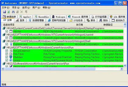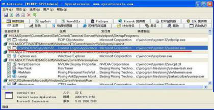 “登陆”- -细心的朋友可以发现,该标签下HKLMSOFTWAREMicrosoftWindowsCurrentVersionRun、HKCU SoftwareMicrosoftWindowsCurrentVersionRun这两个注册表子项的内容与系统配置实用程序“启动”标签下打勾的项目是完全一样的,甚至“登陆”的图标也和系统配置实用程序MSCONFIG.EXE的图标完全相同,呵呵!当然,除了以上项目外,该标签还包括 HKLMSystemCurrentControlSetControlTerminal ServerWdsrdpwdStartupPrograms、HKLMSOFTWAREMicrosoftWindows NTCurrentVersionWinlogonUserinit、HKLMSOFTWAREMicrosoftWindows NTCurrentVersionWinlogonShell这三个自启动子项的内容,这些是用系统配置实用程序“启动”标签看不到的内容。