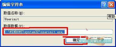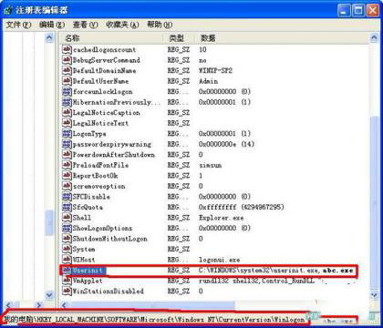 5、用注册表编辑器修改[HKLMSOFTWAREMicrosoft Windows NTCurrentVersionWinlogonUserinit]这个值项的值,由被病毒修改后的“c:windowssystem32 userinit.exe ,ABC.EXE”改为正常的“c:windowssystem32userinit.exe,”(修改注册表值项值的操作这里就不罗嗦了)