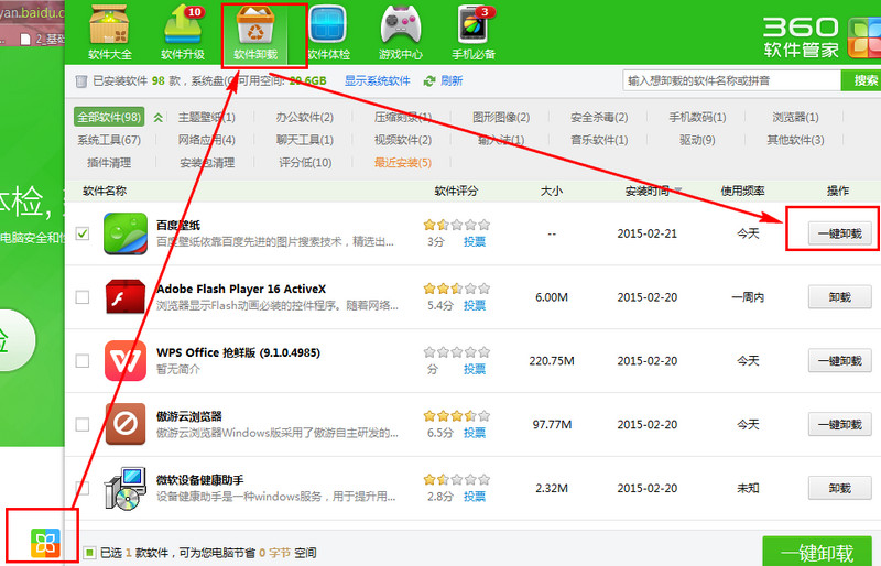方法一:安装了360安全卫士的朋友可以使用360安全卫士,软件管家===卸载软件===一键卸载。