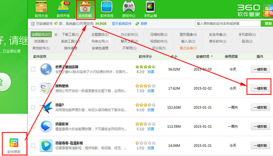 方法二:首先我们可以利用卸载软件360安全卫士,点击软件管家==卸载软件==一键卸载