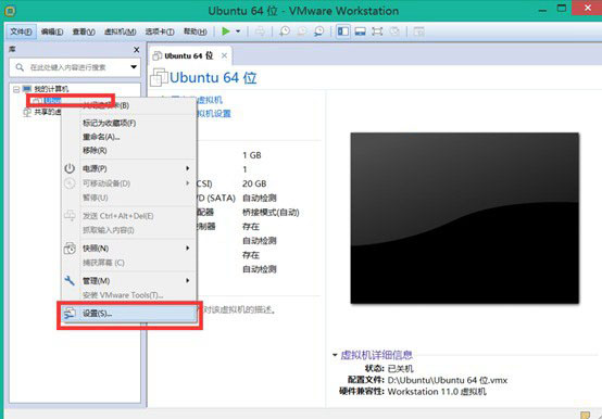 2.打开虚拟机,找到unbutu,右键“设置”,如图所示。