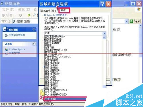 如果是XP系统,选择“高级”项,打开“非Unicode程序的语言”下的下拉框,选择“中文(中国)”这一项,设置就完成了。