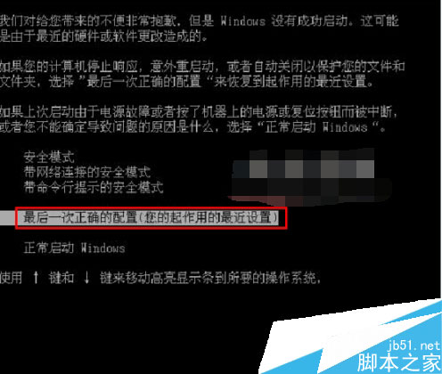 2、选择选项“最后一次正确的配置”启动系统,按回车键会重启电脑系统,稍等片刻系统就成功进入了!该操作非常简单易用,小编的电脑出现这个情况就是这么解决的。如果您的电脑还是不能解决,请看下面分解。