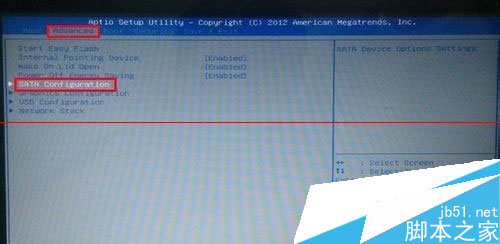 重启电脑,出现开机画面时可尝试按键盘上的F1、F2或Del键进入bios,然后进入到bios界面后按键盘上的左右方向键“←,→”将光标移至“Advanced”,再使用上下方向键“↑,↓”,将光标移至“SATA Configuration”。如下图所示: