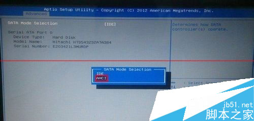 3、然后,按键盘上的回车键,在弹出的小窗口中,使用上下方向键“↑,↓”将光标移至“AHCI”更改(若原选择为IDE时请更换另外一个选项),再按回车键进行确认。如下图所示: