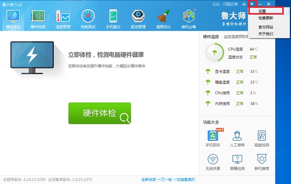 一、首先打开鲁大师软件,然后点击右上角的“下拉箭头”,在弹出的菜单中,点击【设置】,如下图所示。