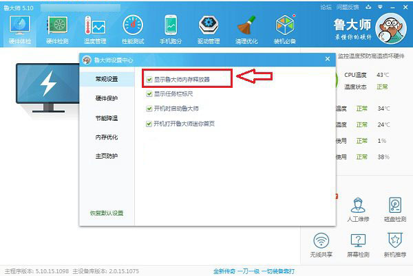 将显示鲁大师内存加速器选项前面的勾去掉之后,关闭鲁大师软件,关闭设置中心就可以了,之后就可以看到鲁大师内存加速器已经不再显示了。
