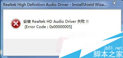 最近有用户不小心将电脑声卡驱动给误删了,然后选择重新安装声卡驱动,在安装过程中出现安装失败并弹出错误提示Error code:0x00000005(如下图所示)导致无法完成安装声卡驱动,下面来看看小编给大家整理的两种声卡驱动安装失败的修复方法吧。
