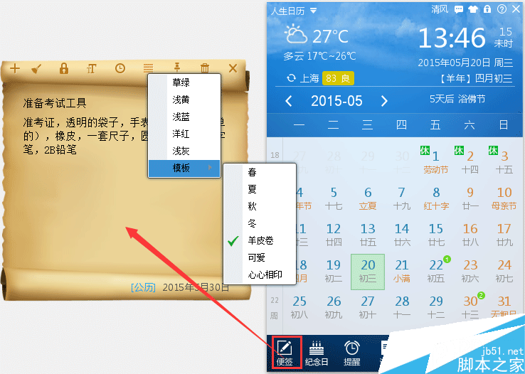 首先,家长可以提前了解考前准备的事项,用人生日历便签功能一一列好锁定在电脑桌面上,做到有条不紊,这样就不会容易漏掉哪一项了。如下图,下载安装人生日历,打开主界面——点击左下角便签——设置便签提示(字体、闹钟提醒、皮肤、是否置顶等),可设置多个标签。