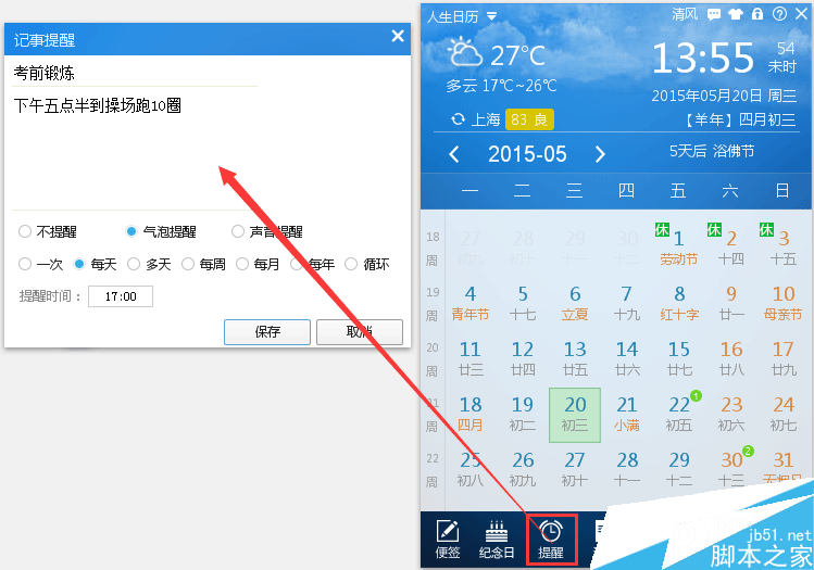 其次,考生要合理安排好作息时间,早睡早起,加强运动,注意考前的心理准备。家长和考生每天用人生日历的提醒功能,将作息时间和身体锻炼安排提前提醒,将身体调整到最好的状态,以便迎接高考。如下图,打开人生日历,点击主界面的提醒功能,设置提醒内容、时间及方式等。