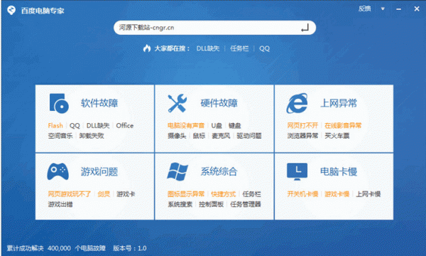 当遇到电脑故障时,您可以通过客户端首页的搜索框进行搜索,或者通过首页的电脑问题分类,定位问题,快速找到解决方案。