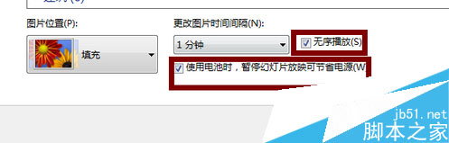 6:勾上“无序播放”和“使用电池时停止播放”点击保存,这样电脑的桌面就自动更换了