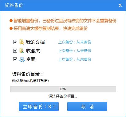 3.点击立即重装按钮后,会出现资料备份界面,提示您是否对我的文档、收藏夹和桌面资料等重要资料备份。点击立即备份后,您就可以在下面的进度条中看到备份的进度和备份文件数量,待备份完成后自动进入下一步。如图三