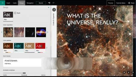 “认识表达思想的全新方式。 Sway是一款数字故事分享应用,适合公司、学校和家庭使用,使你能够快速而轻松地创建和共享精美的交互式报表、演示文稿、个人故事等。 请添加你的内容,其他的交给我们。”