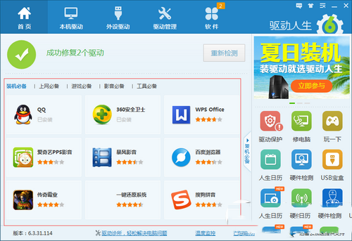 让新买的电脑能够正常使用,最后一步便是安装常用软件了。点击驱动人生“装机必备”按钮,可以勾选你经常使用的软件,一键安装。