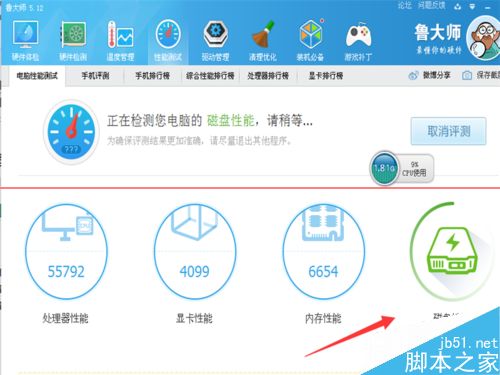 2、先点下性能测试,再点下电脑性能测试,如下图很快已测试到第4项磁盘性能了。