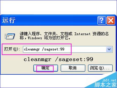 5、下面来介绍下另外一个参数 /sagerun:n 。简单明了的说,前一个参数是设置清理的任务,而这个参数则是开始执行已经设置好的任务,n值推荐和上一个参数的n值保持一致。然后开始--运行输入 cleanmgr /sagarun:99 ,确定