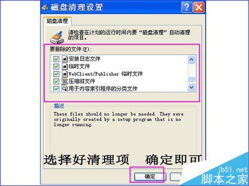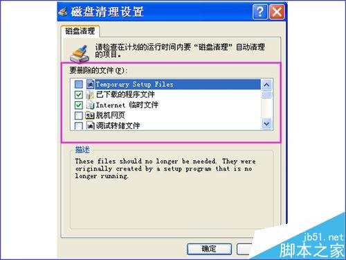 4、开始运行输入 cleanmgr /sageset:99 确定后,弹出”磁盘清理设置“,可以选择要清理的项目
