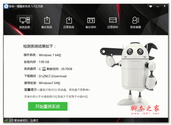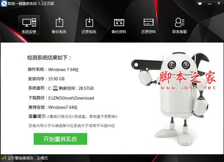 智能一键重装系统是一款免费的系统在线重装工具,这款软件可以让你无需U盘与光驱,只要有网就能一键重装系统,软件使用非常简单,只要按照软件提示步骤操作即可,在重装过程中需要关闭屏幕保护程序以免长时间不操作电脑导致自动休眠造成断网。
