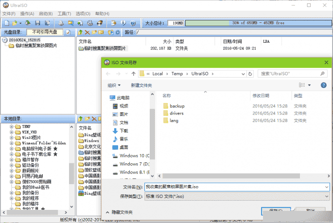 如果要将某个文件夹制作成ISO保存,也可以用软碟通来完成。在UltraISO窗口的上方开启一个新的ISO工程,然后在下方的“本地目录”窗口中找到要制作的文件夹,将其拖动到上方的空白窗口中;之后,按下Ctrl+S按钮,定位ISO存放的目录路径,为ISO文件起名,点击“保存”即可(图4)。
