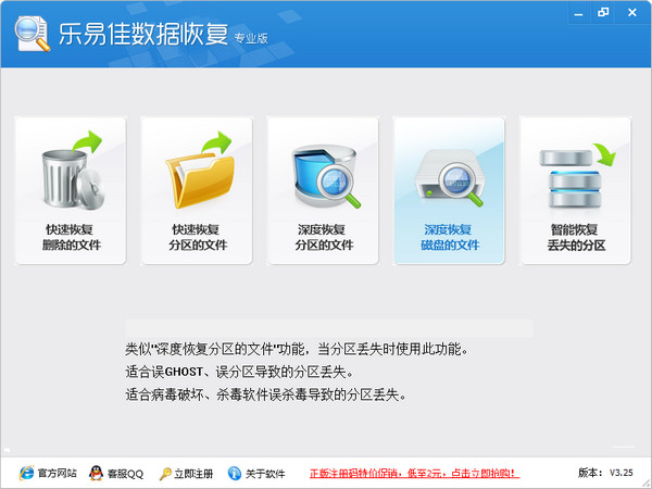 乐易佳数据恢复软件是一款专业数据恢复软件,可以有效解决各种硬件、软件或人为误操作引起的文件、数据丢失问题!支持硬盘、U盘、内存卡等多种设备;FAT16、FAT32、NTFS、exFat等多种文件系统;完美兼容全线Windows系统;急速扫描,智能分析;快速数据恢复与深度数据恢复相结合。