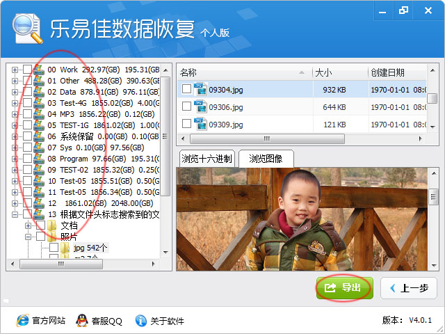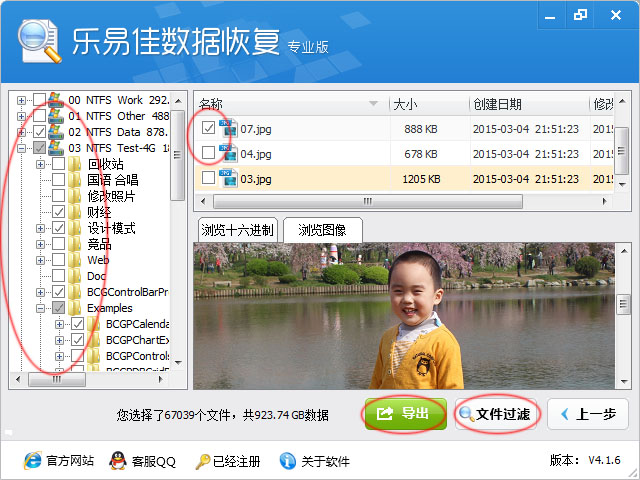 6、如果找到您要恢复的文件,可以在树形控件和列表控件里勾选您需要恢复的文件和目录。然后点击“导出”按钮,导出数据。