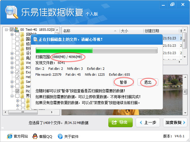 您随时可以点击“暂停”按钮暂停当前扫描进度,立即查看是否找到了您丢失的数据,如果没有找到您丢失的数据,可以继续当前的扫描。