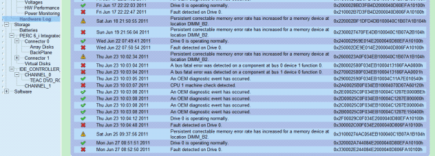 11 下面这里我们硬件日志,这里我们看到,6月17日22:22:03首先在检测到设备0上有错误,接着就是6月18日21:50:55内存发生持久错误,中间重启过一次系统,正常了一段时间,有出错。最下面是从6月27号又开始出现错误,我们又重启了系统。