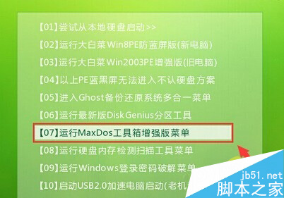 1.将制作好的大白菜u盘启动盘刺进usb接口,重启电脑进入到大白菜主菜单界面,挑选“【07】运转MaxDos工具箱增强版菜单”回车承认。如下图所示
