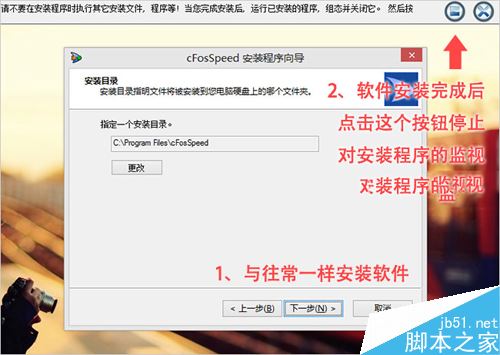 此时会发现屏幕顶部多了一条工具栏,证明 Revo 已经开始在监视软件的安装了。这时就可以像往常一样,一步一步安装 cFosSpeed 了。值得注意的是,在追踪安装的过程中,应尽量避免做软件安装之外的任何其他操作,否则可能会导致 Revo 记录下不是由安装程序产生的记录。安装完成之后,建议先启动运行一下软件(因为很多软件首次启动也会生成一些文件),最后点击右上角第一个图标完成并保存该软件的监视记录。