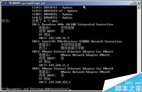 在 DOS提示符下执行“systeminfo”即可获取系统中的所有已经启用网卡的信息,被禁用的网卡信息是无法获取的,如图5所示,可以看到系统中有四个网卡,一个是自适应100M网卡“Broadcom 440x 10/100 Integrated Controller”、无线网卡 “Intel(R) PRO/Wireless 2200BG Network Connection”以及虚拟机网卡 “VMware Virtual Ethernet Adapter for VMnet1”和 “VMware Virtual Ethernet Adapter for VMnet8”。