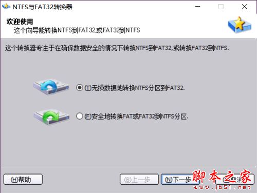 在弹出新界面中,选择要进行转换的方式。老司机的需求是从FAT32转换到NTFS,勾选第二项即可。第一项的作用大多是需要磁盘放到Linux系统中使用。