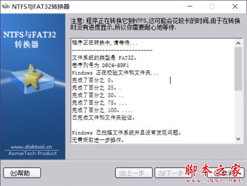 根据磁盘大小、已保存的文件容量将决定这个转换过程的时长。完毕后,会有一个成功的提示。特别提醒,如果可能,请将被转换的硬盘/闪存盘连接到笔记本上执行,如果突然断电,磁盘很可能出错,数据丢失。