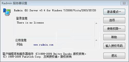 2、安装完成后会运行“Radmin服务器设置”程序,登陆信息栏显示的是There is no license,意思是未授权,如下图所示:
