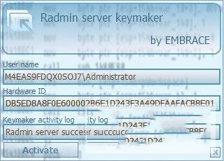3、运行解压包中的keymaker.exe破解程序,点左下角的“Activate”按钮即可成功破解,激活后会显示“Radmin server successfully activated!”。如下图所示: