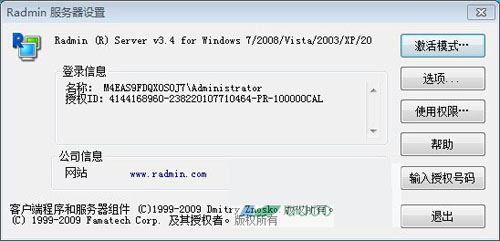 4、重新运行“Radmin服务器设置”程序,这时登陆信息栏会显示授权ID,说明已经激活成功。如下图所示: