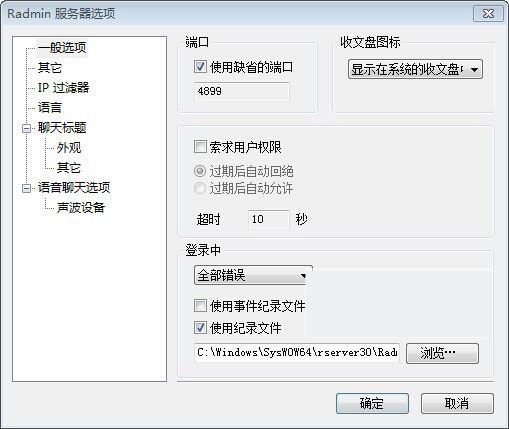 5、在以上图点“选项”按钮,弹出“Radmin服务器选项”,可以设置端口(默认为4489)、暂停联机模式,ip过滤等,设置完关闭即可。如下图所示: